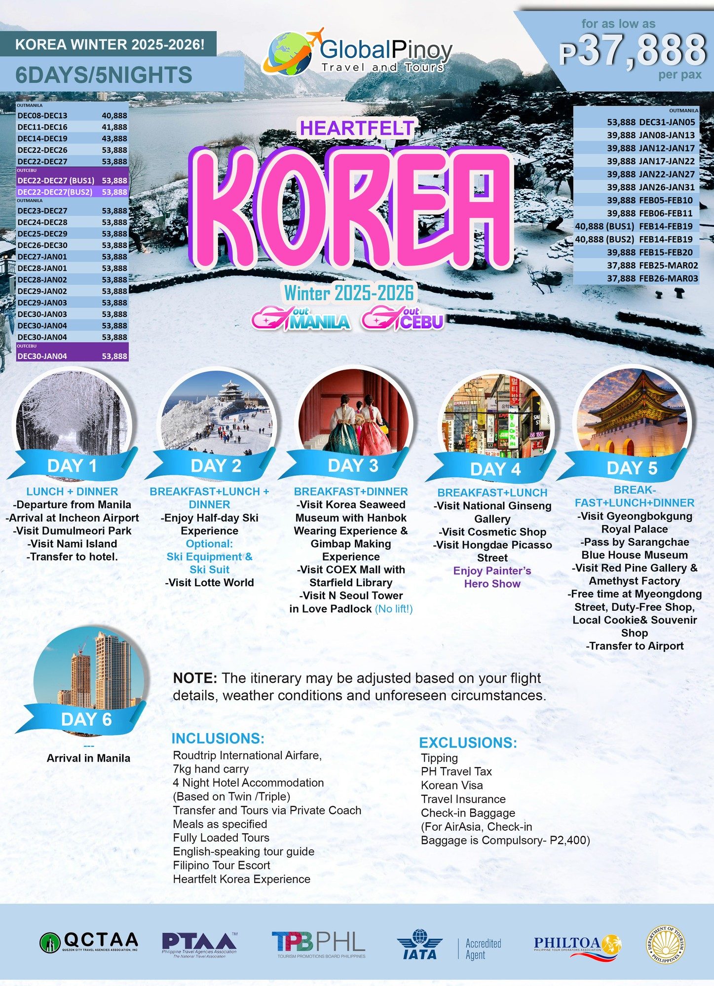 Roundtrip International Airfare, 7kg hand carry, 4 Night Hotel Accommodation (based on twin/triple), transfer and tours via private coach, meals as specified, fully loaded tours, english-speaking tour guide, Filipino tour escort and heartfelt Korea experience.